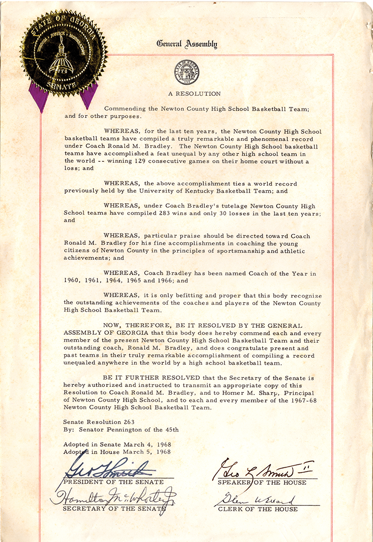 By the time Bradley was done, the numbers were downright staggering. He had compiled a 1,372–413 record, giving him the highest win total of any high school basketball coach in state history. Keep in mind, this says nothing of the successes he enjoyed coaching baseball (158 wins) and football (130 wins). Bradley belongs to seven different halls of fame and drew enough attention for his exploits that he was featured in Sports Illustrated twice. The gymnasium at Turner Lake Park in Covington now bears his name—an honor bestowed upon him by the Newton County Recreation Commission.